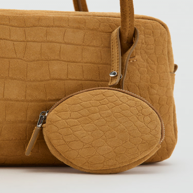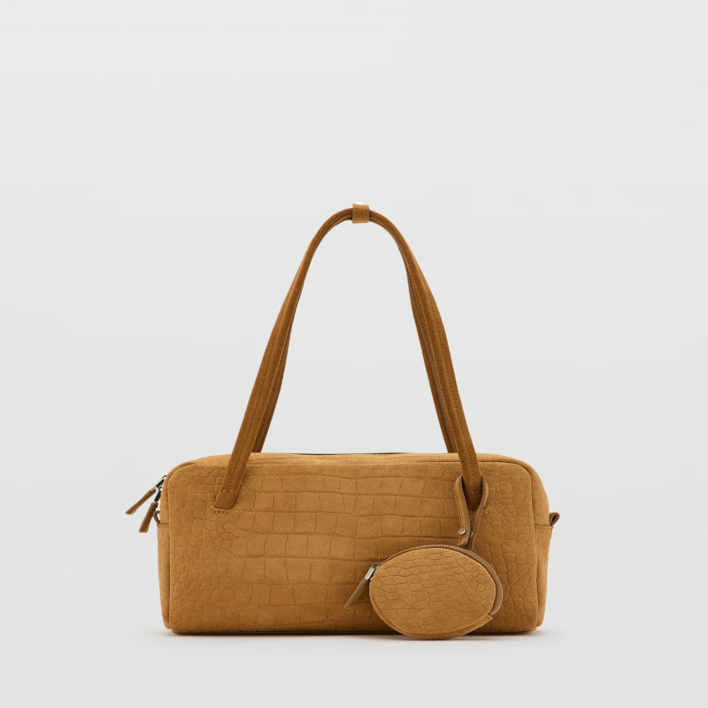 100% piel bovino. Piel de serraje. Tamaño pequeño. Dos asas de hombro. Charm monedero. Cierre de cremallera. Forro interior.