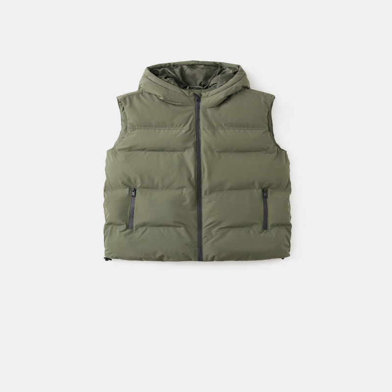 Tejido poliéster. Tejido acolchado. Diseño recto. Con capucha. Cierre delantero con cremallera. Dos bolsillos laterales.