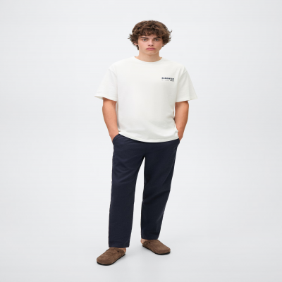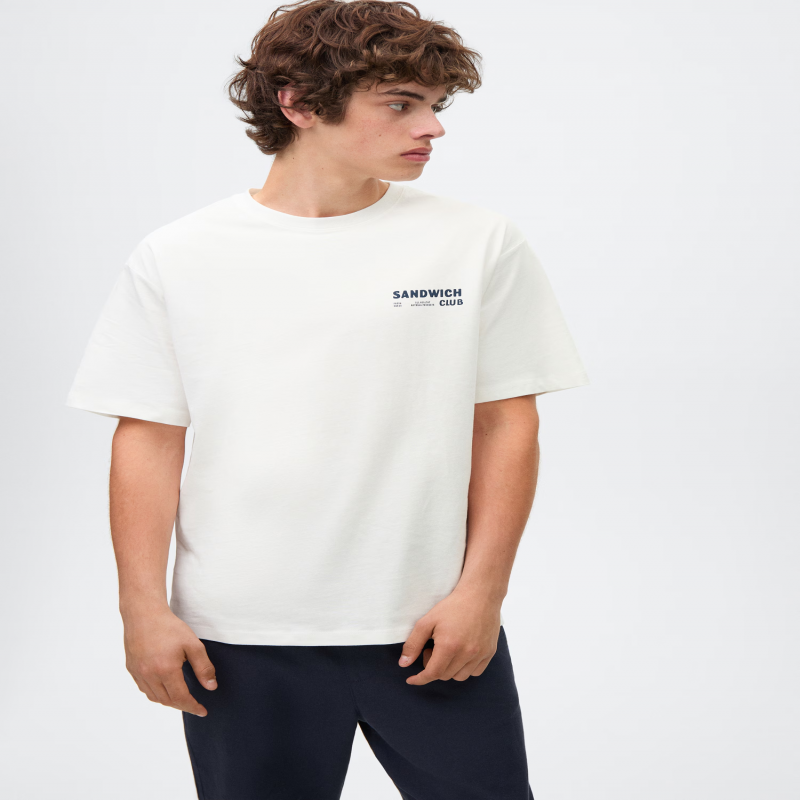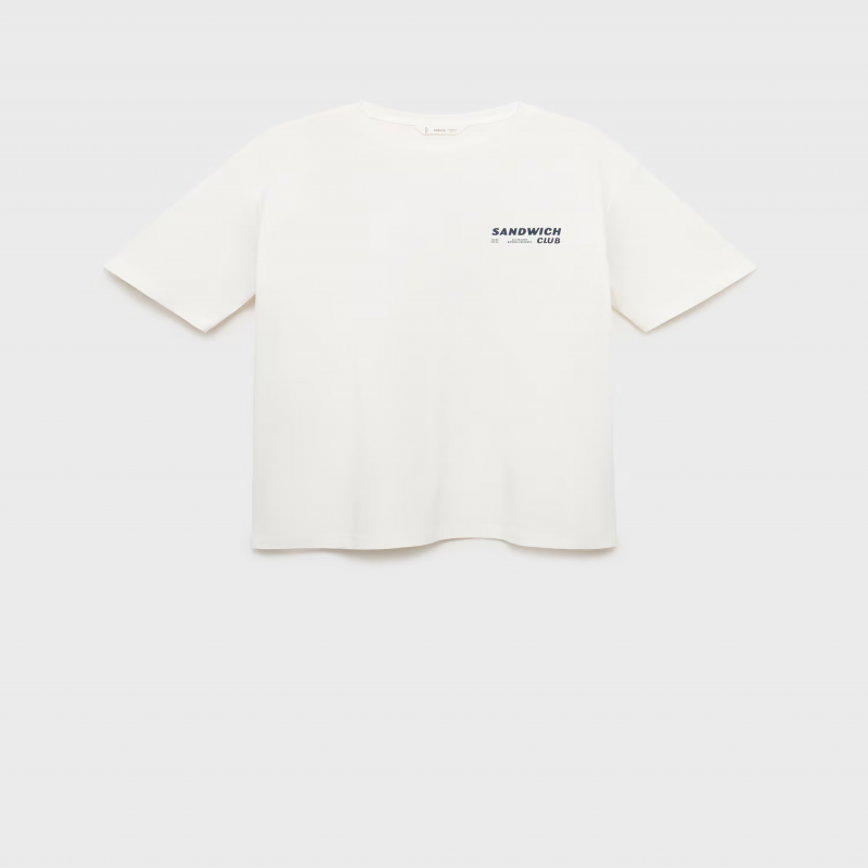 Tejido 100% algodón. Diseño recto. Cuello redondo. Manga corta. Texto estampado en el pecho. Dibujo estampado en la parte trasera.