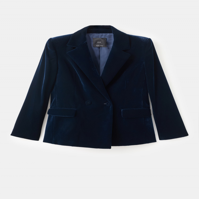 Tejido de terciopelo. Diseño recto. Cuello pico con solapa. Solapas con muesca. Manga larga con puños abotonados. Dos bolsillos de solapa en la parte frontal. Cierre delantero con botones cruzados. Forro interior. Disponible Plus.